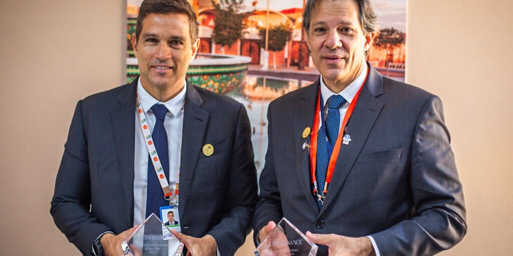 A premiação foi entregue em Marrakech, no Marrocos, onde Haddad e Campos Neto participam até este sábado (14) da reunião anual do Fundo Monetário Internacional (FMI) e do Banco Mundial. O encontro reúne ministros de Finanças e presidentes de Bancos Centrais de 189 países e, tem como destaque, a reforma no financiamento de instituições multilaterais e a presidência do Brasil no G20, grupo das 20 maiores economias do planeta.