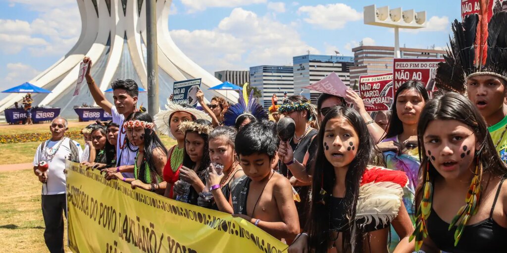 Em seguida, por volta das 12h30, os indígenas saíram em marcha pacífica pela Esplanada dos Ministérios até a Praça dos Três Poderes, onde acompanharão o julgamento do STF nesta tarde.