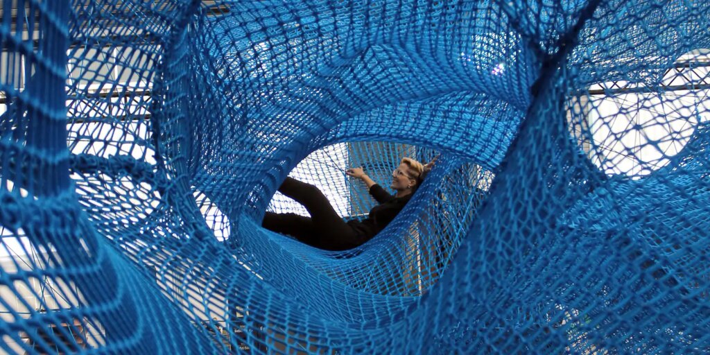 A instalação Tube convida os visitantes a explorar uma rede arquitetônica tridimensional. A suspensão da rede faz com que ela balance e se mova enquanto os visitantes se movem juntos pela formação sinuosa. A transparência cria uma sensação de flutuar livremente e também uma tensão entre a segurança de estar cercado pela rede de suporte e o perigo da altura vertiginosa.