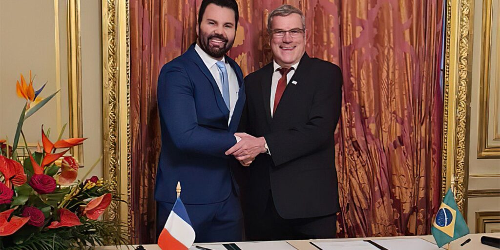 O documento foi assinado pelo diretor-presidente do SGB, Inácio Melo (à direita na foto), e o diretor-geral francês, Jean-Claude Guillaneau (à esquerda), em paralelo à realização da Exposição Nuclear Mundial (WNE, em inglês), em Paris.