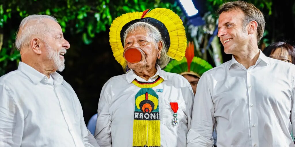 Cacique Raoni recebe honraria de Macron e pede demarcações a Lula