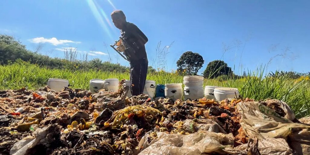 “A gente disponibiliza um kit para fazer a separação dos resíduos, que é um baldinho de 16 litros, mais uma sacola compostável, além de serragem para evitar o mau cheiro. E fazemos a coleta uma vez por semana. Depois da coleta, a gente leva para o nosso pátio de compostagem, onde usa o método termofílico (que utiliza temperaturas elevadas para decomposição dos materiais). Então, a gente consegue compostar tanto cozidos, carnes e cítricos, que são matérias orgânicas não compostadas nos minhocários domésticos”, explica Micael.