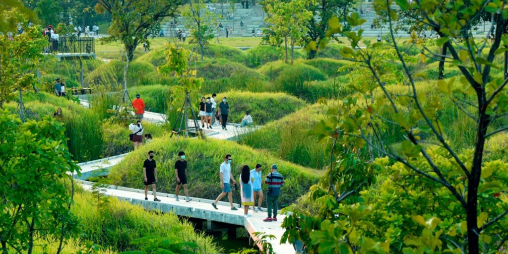 O conceito desenvolvido por Yu não se limita a criar áreas cuja única finalidade é ser um espaço alagável. Ele trabalha com a harmonização entre construções e natureza. Os exemplos mais recorrentes são parques que, durante estações de seca, são frequentados pelas pessoas. Muitos são um emaranhado de trilhas e passarelas cercadas por pequenos lagos e muito verde. “Seguros e bonitos”, descreve.
