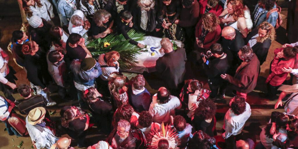 A despedida ocorre da forma como Zé Celso vivia: cercado de amor e espalhando alegria. No início desta noite, ainda esperando pela chegada do corpo do diretor, amigos e atores do Oficina organizaram um grande cortejo pelo palco, o qual foi concebido pela arquiteta Lina Bo Bardi. Palco esse que inovou a concepção de teatro ao colocá-lo no centro, como se fosse um corredor, com a plateia nas laterais, se enfrentando como se estivessem em um ringue. “O cenário no ringue representa a metáfora da luta”, dizia Zé Celso sobre a premiada arquitetura do teatro.