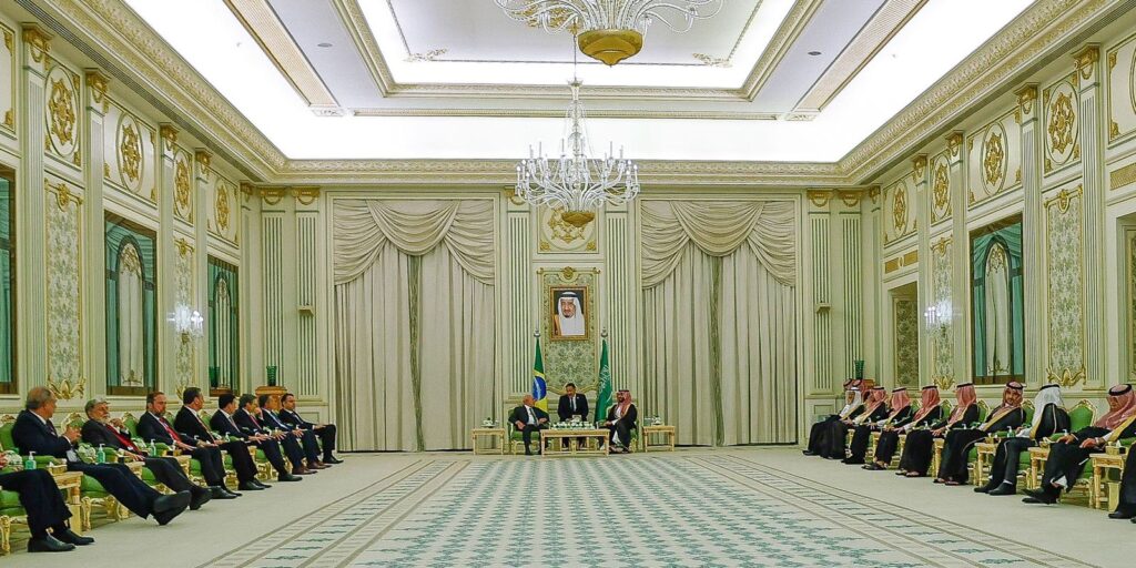 O presidente Luiz Inácio Lula da Silva se reuniu nesta terça-feira (28), com o Príncipe Herdeiro e Primeiro-Ministro da Arábia Saudita, Mohammed bin Salman, em Riad, capital da Arábia Saudita. Os dois líderes estimam que as transações comerciais entre os dois países podem saltar dos atuais US$ 8 bilhões para US$ 20 bilhões até 2030.