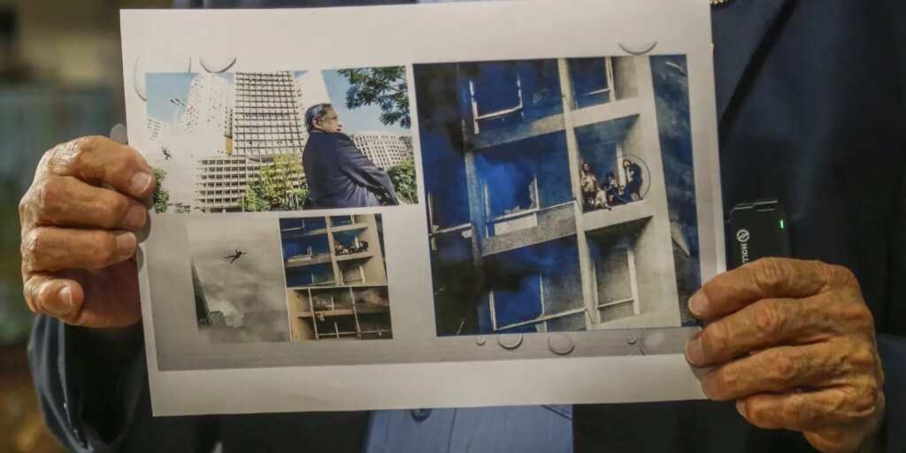 “Na hora exata do incêndio, eu estava na sala do meu diretor, no 22º andar. Nessa sala tem um banheiro privativo. Estávamos eu, ele e uma secretária preparando a apresentação, quando escutamos uma barulhada de vidros explodindo. Meu chefe pegou um extintor e saiu correndo. A secretária foi atrás dele. Eu estava correndo atrás deles, mas lembrei que tinha esquecido minha caneta [que havia ganhado do pai] e voltei. Peguei a caneta, minha mala e meu paletó. Quando fui sair de novo, alguns segundos depois, o hall dos elevadores e a escada já haviam virado uma chaminé. Tentei subir ou descer pela escada, mas não consegui e acabei voltando para a sala onde estava. Nesse meio tempo, seis pessoas apareceram por ali. O Hiroshi era uma delas”, contou.