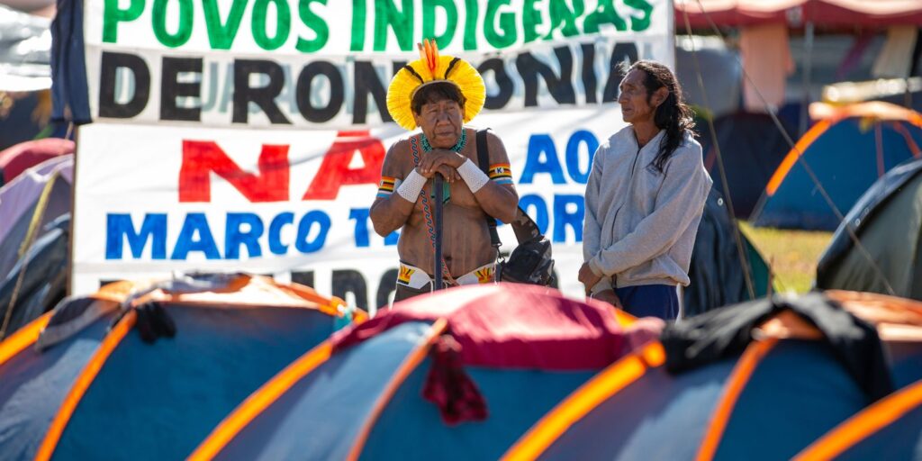 Desde segunda-feira (5), indígenas de todo o país se reúnem, em Brasília, em um acampamento montado perto da Esplanada dos Ministérios, para acompanhar a decisão da Corte.