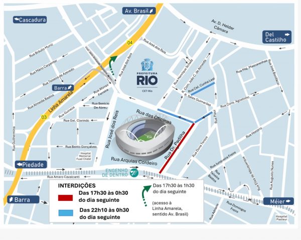 A CET-Rio montou uma operação de trânsito, nesta terça-feira (18/11), para o jogo entre Botafogo e Sport, às 20h30, no Estádio Nilton Santos, pelo Campeonato Brasileiro. As interdições ao tráfego de veículos na região começam pela Rua Dr. Padilha a partir das 17h30 e vão até 0h30 de quarta-feira (19/11).