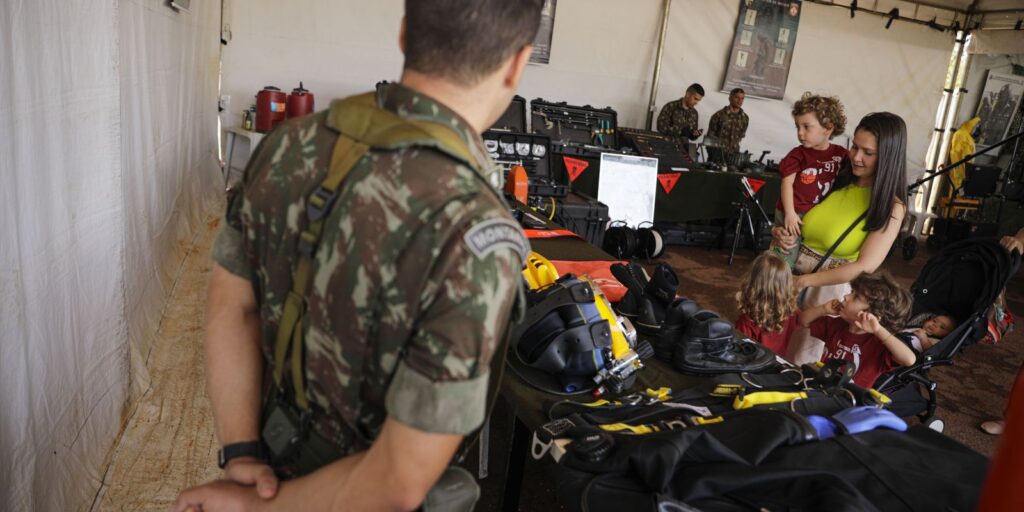 Na tenda da Marinha do Brasil, o simulador de paraquedismo com óculos virtual, provoca fila de crianças que querem experimentar a sensação de voar e ver a paisagem do alto. O estudante Pietro Osaka, de 8 anos, foi uma das crianças que se aventurou. A mãe, a funcionária pública Fabiana Osaka quer passar ensinamentos ao filho com a visita. “Muita gente pensa que a defesa é só em caso de guerras ou quando há um monte de militar lá na Esplanada dos Ministérios. Mas, a defesa não é só isso. Trago meu filho para desenvolvimento dele, para entender o militar, a educação militar, os valores militares, sem contar que tem a parte da lúdica e, também, para saber como funciona, quais são os equipamentos que o Brasil tem”.