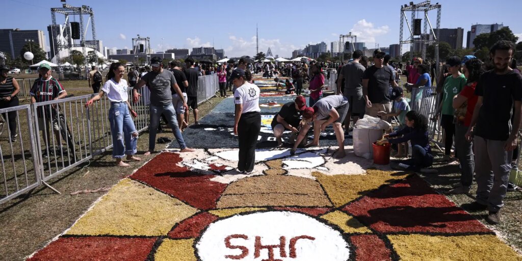 Brasília (DF), 30/05/2024 - Fiéis confeccionam os tradicionais tapetes de Corpus Christi na Esplanada dos Ministérios, em Brasília. Foto: Marcelo Camargo/Agência Brasil