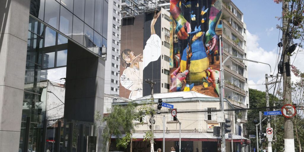 Cada uma dessas duas imagens que foram pintadas na parede de um mesmo prédio residencial localizado na Avenida Pedroso de Morais, número 144, expressa estilo e linguagens diferentes. Mas elas foram feitas por meio de um trabalho colaborativo e estão lado a lado para lembrar os dois anos da guerra entre a Ucrânia e a Rússia e defender proteção ambiental. Chamado de The Exchange (o intercâmbio, em português), o mural está sendo inaugurado hoje (5) e é uma iniciativa do Instituto Ucraniano no Brasil.