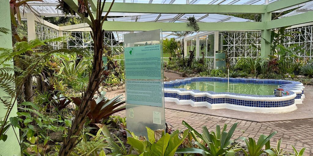 Marcus Nadruz informou que muitas bromélias estão presentes também em diversos canteiros no arboreto, seja na forma de epífitas, que se desenvolvem sobre árvores e palmeiras, como introduzidas a partir de excedentes clonais da coleção científica.