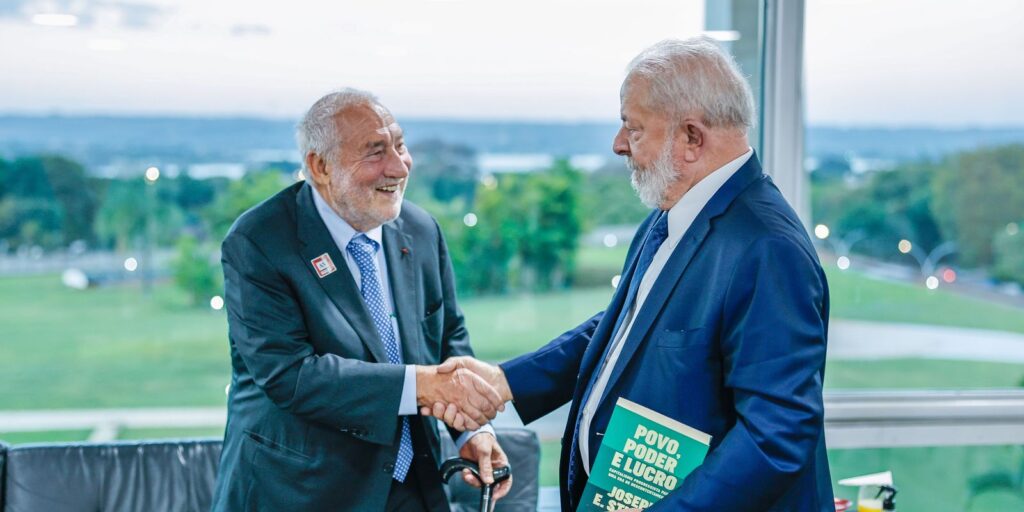 O presidente Luiz Inácio Lula da Silva recebeu, na tarde desta quarta-feira (13), no Palácio do Planalto, em Brasília, economista Joseph Stiglitz, professor da Universidade de Columbia, nos Estados Unidos, e ganhador do Prêmio Nobel de Economia. Segundo a assessoria de Lula, o presidente agradeceu as menções positivas de Stiglitz sobre a reforma fiscal, os resultados recentes da economia e o aumento na geração de empregos, além da reativação de programas sociais e investimentos em obras de infraestrutura, retomados pelo atual governo.![]()