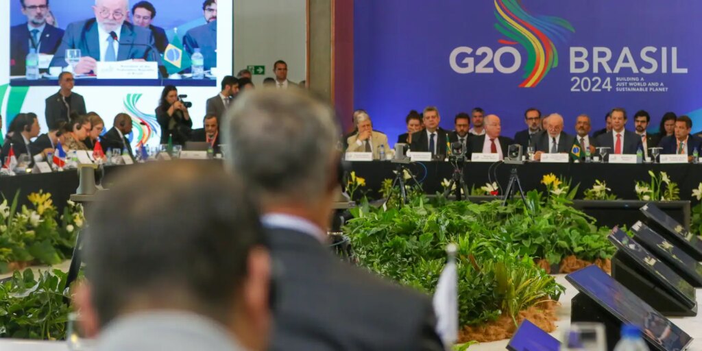 O lema da presidência brasileira do G20 é “Construindo um Mundo Justo e um Planeta Sustentável”.