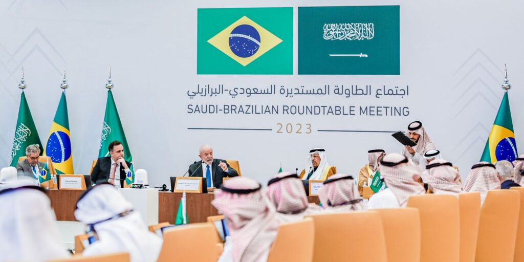 Lula e Salman se reuniram ontem (28) em Riad. Os dois líderes estimam que as transações comerciais entre os dois países podem saltar dos atuais US$ 8 bilhões para US$ 20 bilhões até 2030.