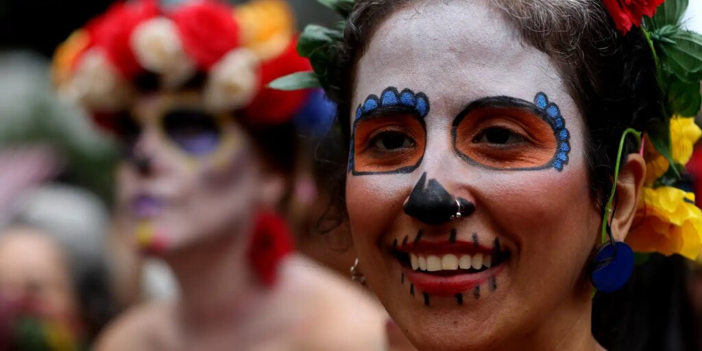 “No Peru e no México, o Dia dos Mortos é uma celebração, porque é uma lembrança de que a gente tem que aproveitar a vida, mas a gente também tem que agradecer aos nossos parentes que se foram e deixaram ensinamentos. É uma gratidão para eles. Para a gente, é um momento de agradecer por estar vivo e a gente vai continuar vivendo em outras esferas para que outros cheguem. A gente tem esse problema de pertencer. Acho que o Dia dos Mortos nos faz lembrar que é uma passagem e tem que aproveitar”, explica a atriz e narradora de histórias peruanas, Rosana Reategui, que coordena o bloco.