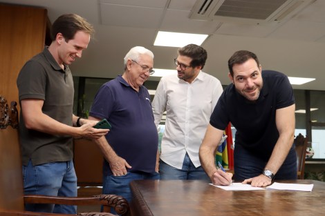 O prefeito Tiago Amaral assinou, na tarde desta quarta-feira (8), o contrato que estabelece a cessão do Estádio Vitorino Gonçalves Dias (VGD) pelo Londrina Esporte Clube (LEC) para a Copa do Mundo Fifa de Futebol Feminino de 2027. Também assinaram o documento o presidente da Fundação de Esportes de Londrina (FEL), Felipe Prochet, o presidente do Londrina Esporte Clube, Getúlio Castilho, e o CEO da Sociedade Anônima de Futebol (SAF) do LEC, Armando Chekerdemian.