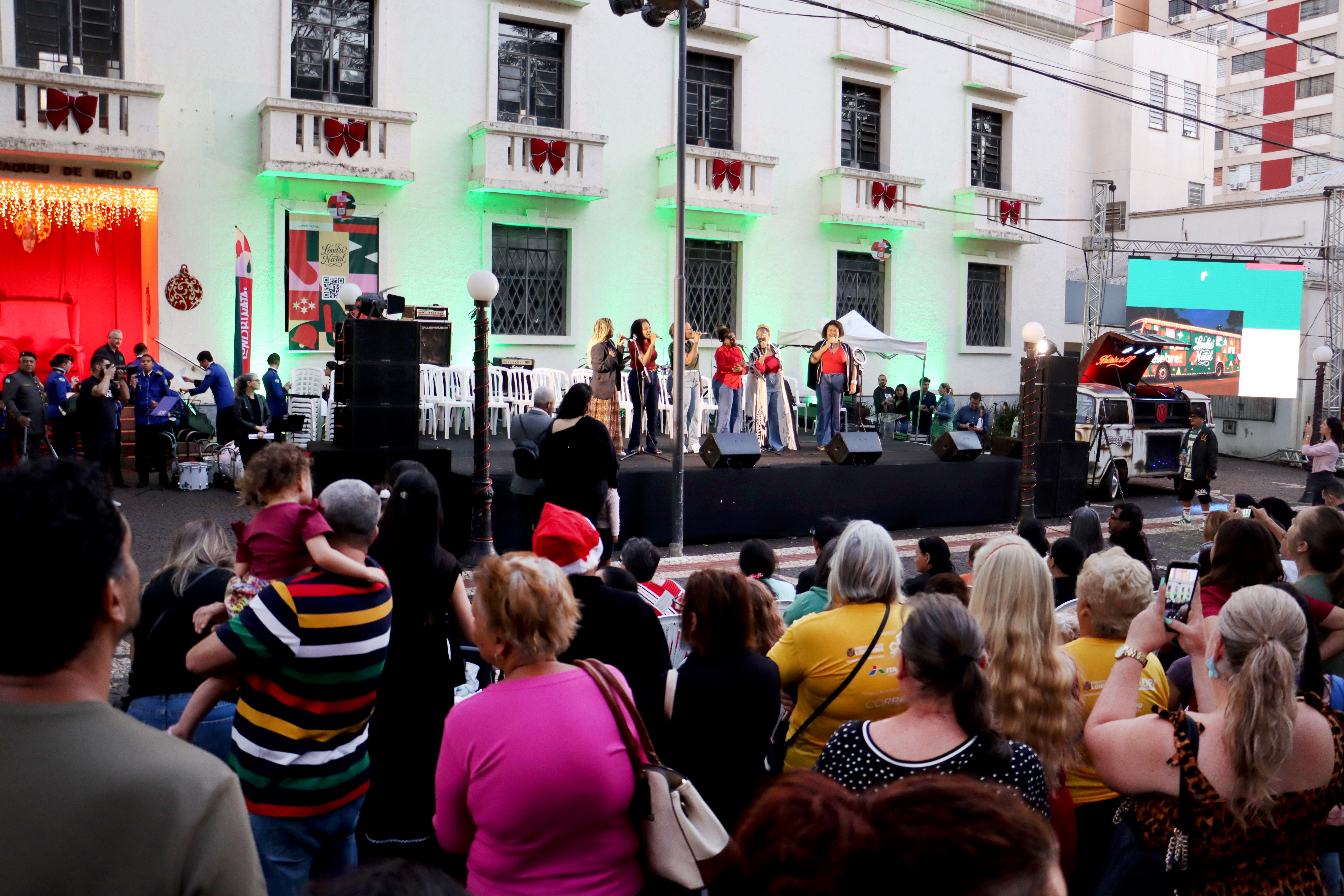 A inauguração oficial do LondriNatal 2025 ocorreu na noite desta terça-feira (18), em frente à Biblioteca Professor Pedro Viriato Parigot de Souza e ao Teatro Municipal Zaqueu de Melo, na Avenida Rio de Janeiro. O evento, marcado pela chegada do Papai Noel em uma catita, teve a participação do prefeito de Londrina, Tiago Amaral; do secretário municipal de Cultura, Marcão Kareca; e da presidente da Associação Comercial e Industrial de Londrina (Acil), Vera Antunes, juntamente com vereadores, autoridades e lideranças locais, mais os integrantes do secretariado municipal.