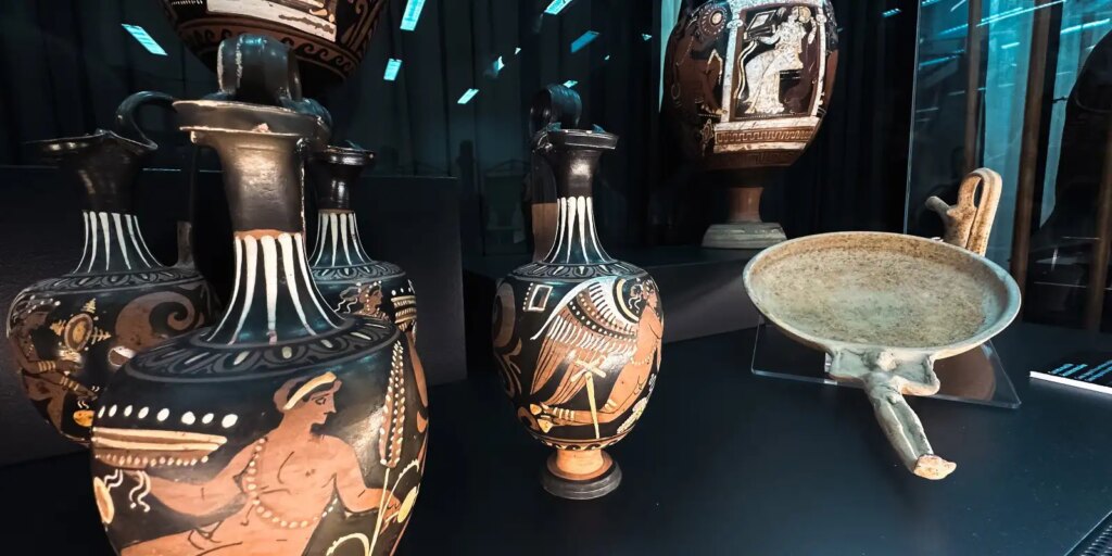 Entre as peças, estão também vasos feitos para este uso funerário. Segundo Mercuri, era uma produção típica e única de Canosa, com inspiração nos vasos típicos da cultura grega. “A exposição se chama Formas e Cores, exatamente porque são as características mais surpreendentes. Esta cor rosa e estas formas aplicadas nos vasos, agregando pequenas esculturas cerâmicas às urnas funerárias”, apontou o curador.