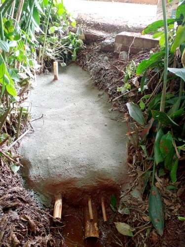 Na técnica aplicada para reconstituir as nascentes, a massa de solo-cimento produzida forma o reboco das paredes dos barrancos das nascentes para que não desmoronem. A utilização desse componente em construções é uma prática bastante difundida no meio rural e pode ser adaptada para diferentes contextos. No caso das nascentes, após o fechamento das paredes, fica formada uma caixa que recebe preenchimento manual com pedras de variados tamanhos. Por fim, há a desinfecção com cal hidratada sobre as pedras, fechamento e finalização.