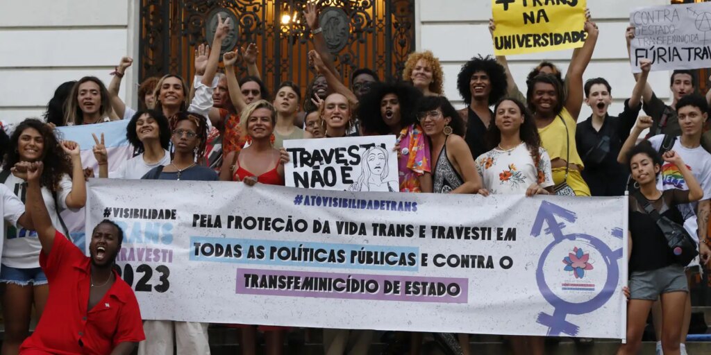 Ativistas trans e defensores dos direitos humanos ocuparam as escadarias do parlamento municipal com faixas e cartazes e protestaram contra a discriminação, a violência e a exclusão da população trans de espaços como o mercado de trabalho e a educação.